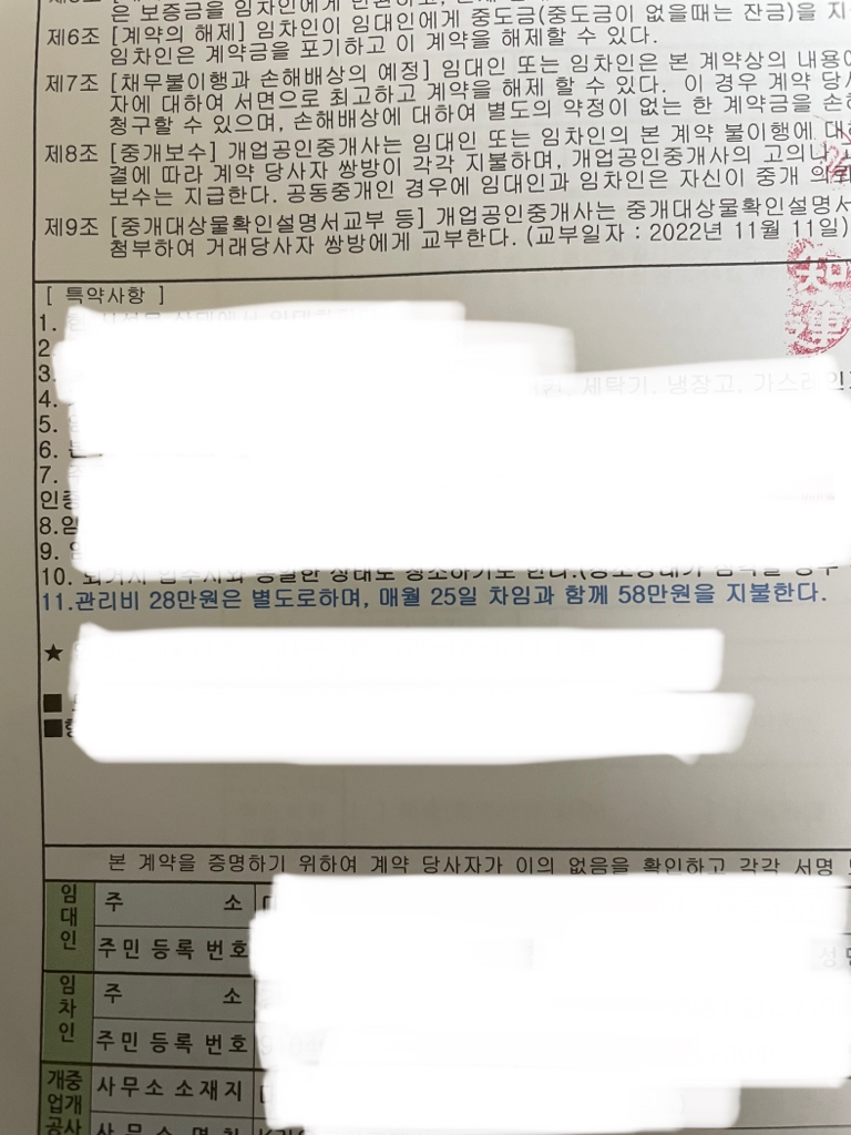 중개수수료가 있는지 모르는 상태에서 계약서를 쓰는날 알게돼서 1차로 당황했고 또 이상한게 월세가 58만원이라고만 했지 관리비에 대해서는 얘기가 없었는데 계약서 쓰면서 보니 월세 30만원에 관리비 28만원이더라구요 이것도 이상했는데 이사하는날 알게되서 그냥 계약하고 이제 이사한지 한달되서 월세 내려고 계약서를 다시 봤는데 중개수수료가 월세+관리비로포함된걸로 계산이됐더라구요