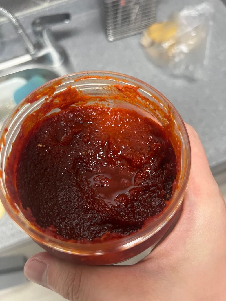 집 고추장색깔좀봐주세요~!!!!! 냉장고에둔지는 2년이상된것같습니다. 냄새가약간 변한건아닌데 좋지않아서 폐기처분하려는데 저 희여멀건한쪽은 상한부분인가요?? 버려야겠죠?