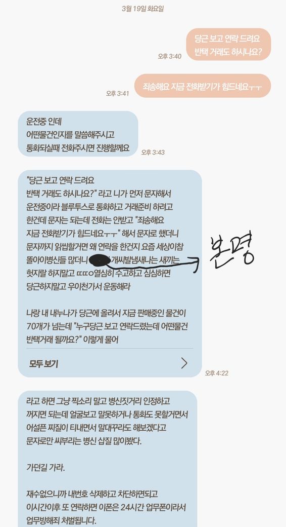 당근 거래 하다가 어처구니 없는 문자를 받았는데요
