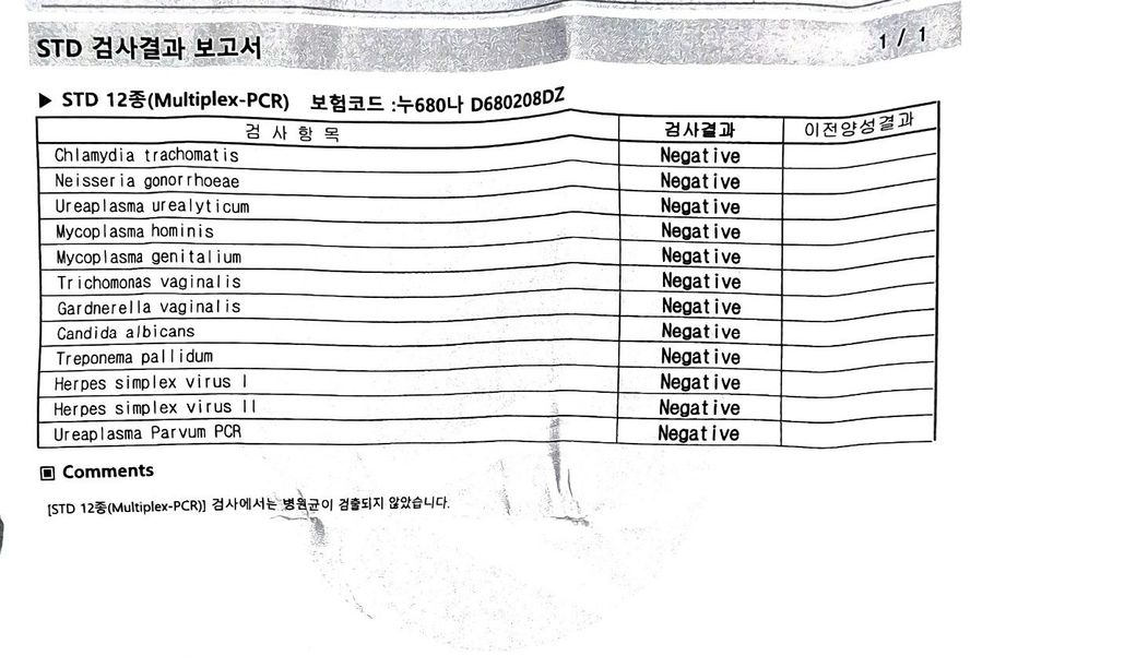 제시된 검사지는 STD 12종 multiplex PCR로, 전반적으로 “성접촉으로 전파 가능한 병원체”를 중심으로 구성된 패널입니다. 결과는 전부 음성입니다.