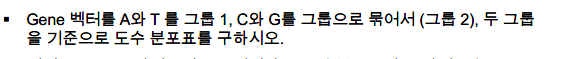 Gene 벡터를 A와 T를 그룹1, C와 G를 그룹으로 묶어서 (그룹2), 두 그룹을 기준으로 도수 분포표를 구하시오.