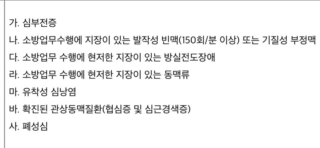 두근거림이나 흉부 불편감, 어지러움 등의 증상을 유발할 수 있는데 "소방업무 수행에 지장이 있는" 이라는 명시가 있는걸 보면 단순 부정맥만 가지고 결격사유에 해당하지는 않고 증상이 있어야 하기 때문에 작성자분에게 문제될건 없어보입니다.