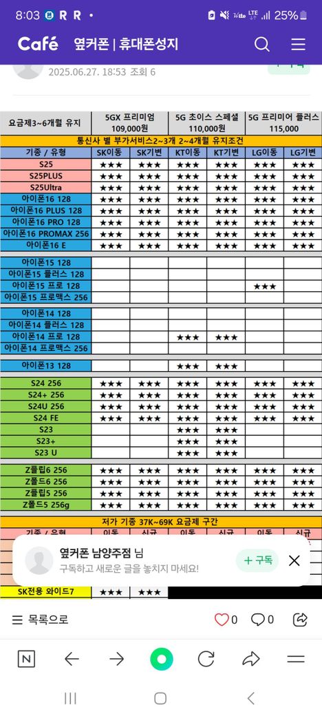 옆커폰 시세표에서 가격 옆에 별표★ 표시되어 있는 경우는 보통 공개적으로 가격을 명시하기 어려운 조건부 가격이거나, 현장 방문 시에만 안내되는 특가를 의미하는 경우가 많아요. 즉, 별표는 “이 가격은 온라인에 직접적으로 표시할 수 없으니, 매장에 문의하거나 방문해서 확인하세요”라는 뜻에 가까워요. 이는 통신사 정책이나 마케팅 조건, 또는 불특정 다수에게 노출되면 안 되는 비공식 할인 조건 때문이라고 생각합니다.