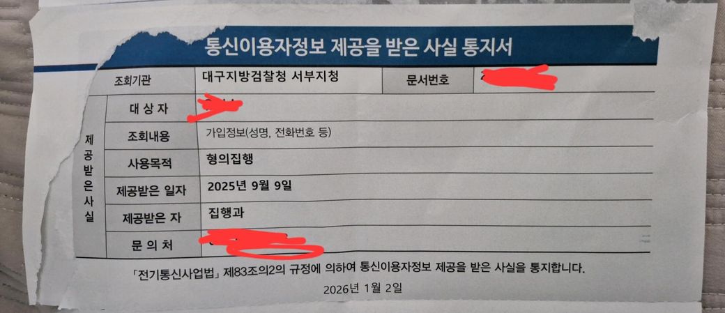 대구지방검찰청 서부지청에서 형의집행 목적으로 25년 9월9일에 가입정보 실명 전화번호를 조회하고 제공받았다고 합니다