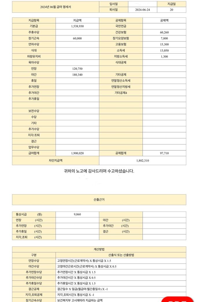 평소에 기본급도 190만원이였는데 6월달 꽉채워서 일한게 아니여서인지 기본급도 평소보다 적게 나왔는데 맞게 받은걸까요?