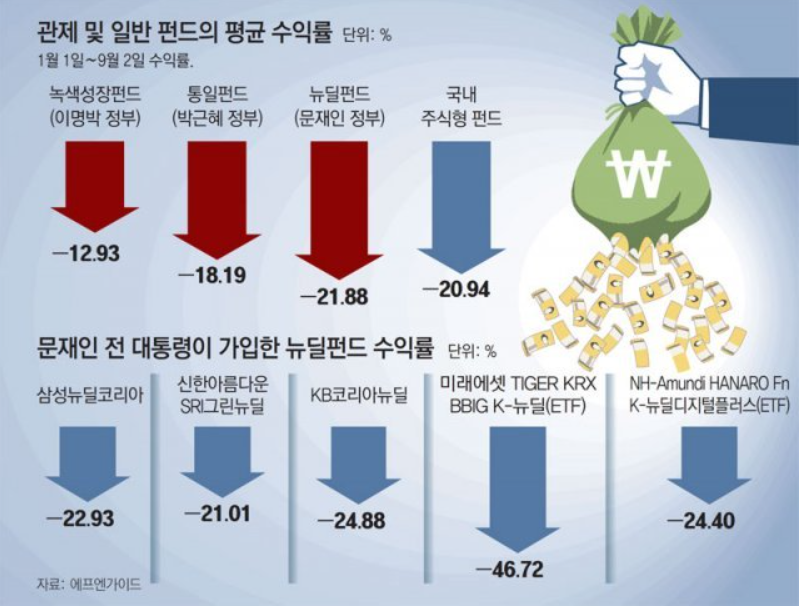 뉴딜펀드를 내놓을 당시에 금융위원장 은성수는 “사실상 원금이 보장되고, 수익률은 국고채 금리보다 더 높게 만들 것”이라고 강조했디만 금리인상으로 인해서 경기가 위축되고, 주식 시장이 침체되면서 뉴딜펀드 수익률도 급락하였습니다.