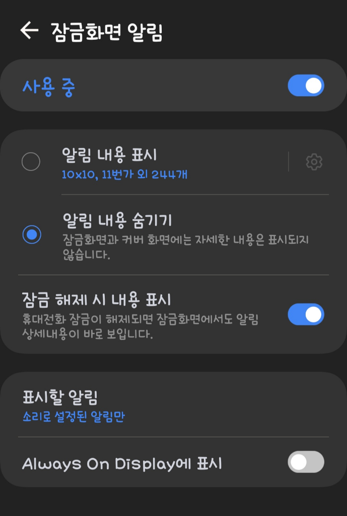 설정 > 잠금화면 > 커버 화면 알림을 엽니다.