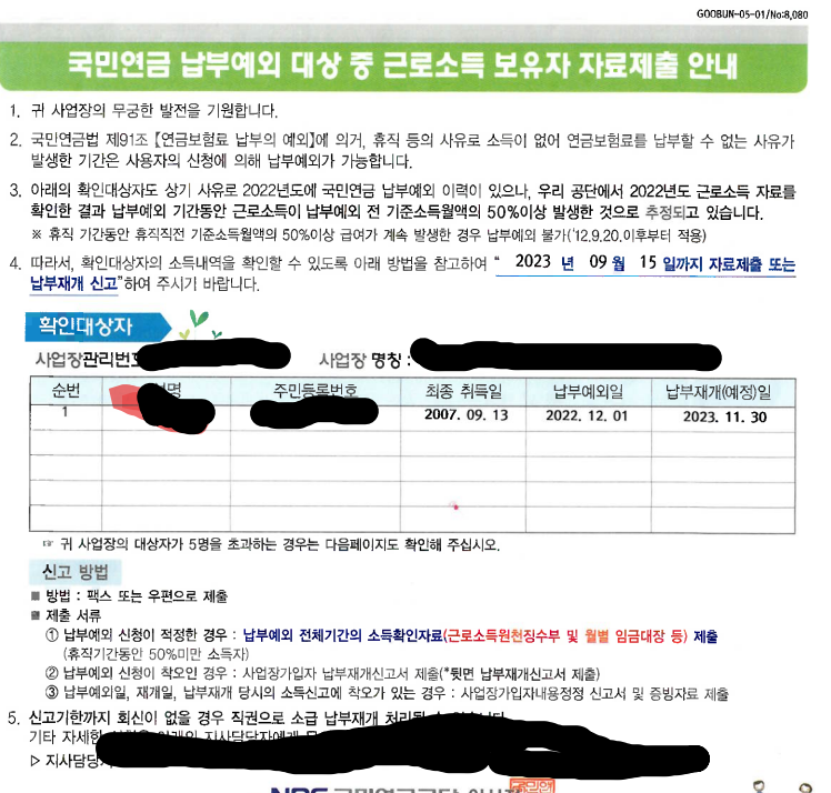 국민연금 납부예외 중인데 근로소득 보유자로 자료제출 안내 우편이 왔습니다.,