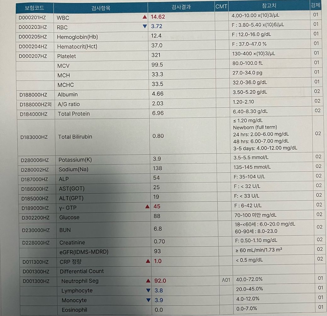 간기능 수치 중 감마지티피가 45로 경도 상승해 있으나, 급성 감염 상황에서 흔히 동반되는 비특이적 변화로 보이며 현재 임상적으로 중요한 수준은 아닙니다. 신장기능, 전해질, 혈당은 안정적입니다. 적혈구와 헤모글로빈은 약간 낮거나 경계 수준이지만 급성 증상과 직접적인 연관성은 낮습니다.