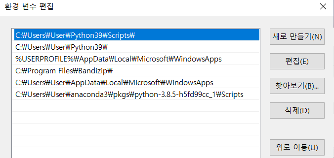 고급시스템에서 환경변수에 python.exe 경로랑 script경로도 넣어줬는데