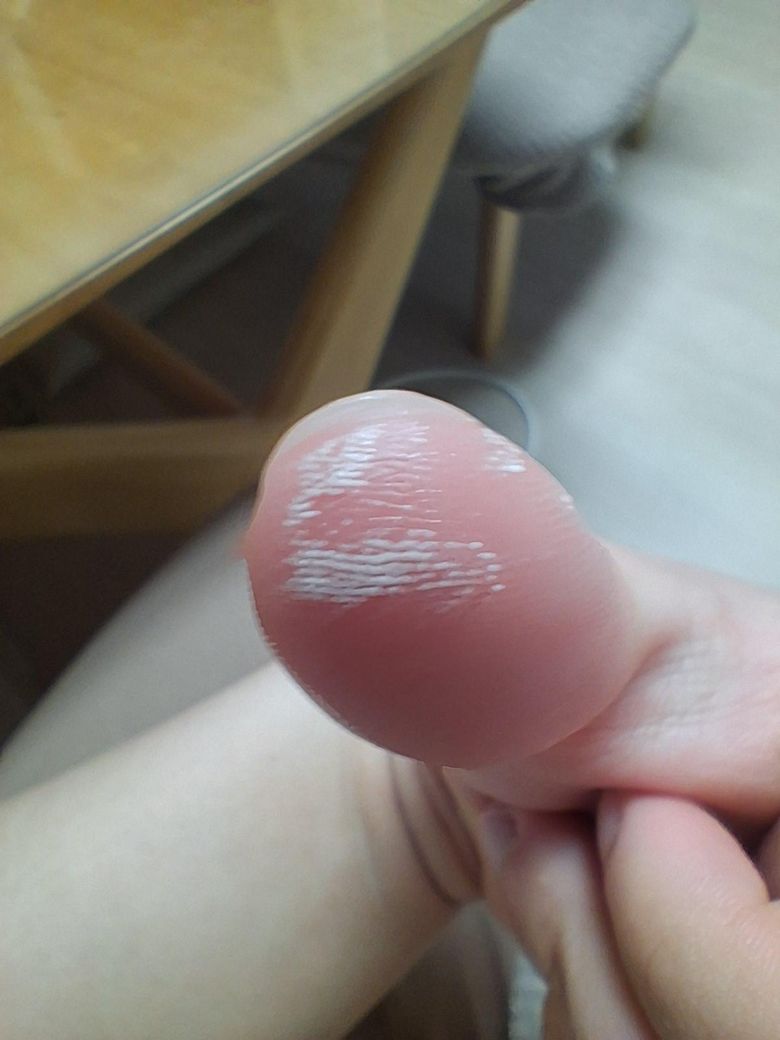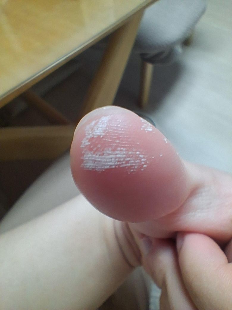 사진상 엄지 끝 피부가 국소적으로 하얗게 일어나면서 각질이 들뜬 모습입니다. 통증이나 출혈, 수포 없이 표면만 변화된 형태로 보입니다.