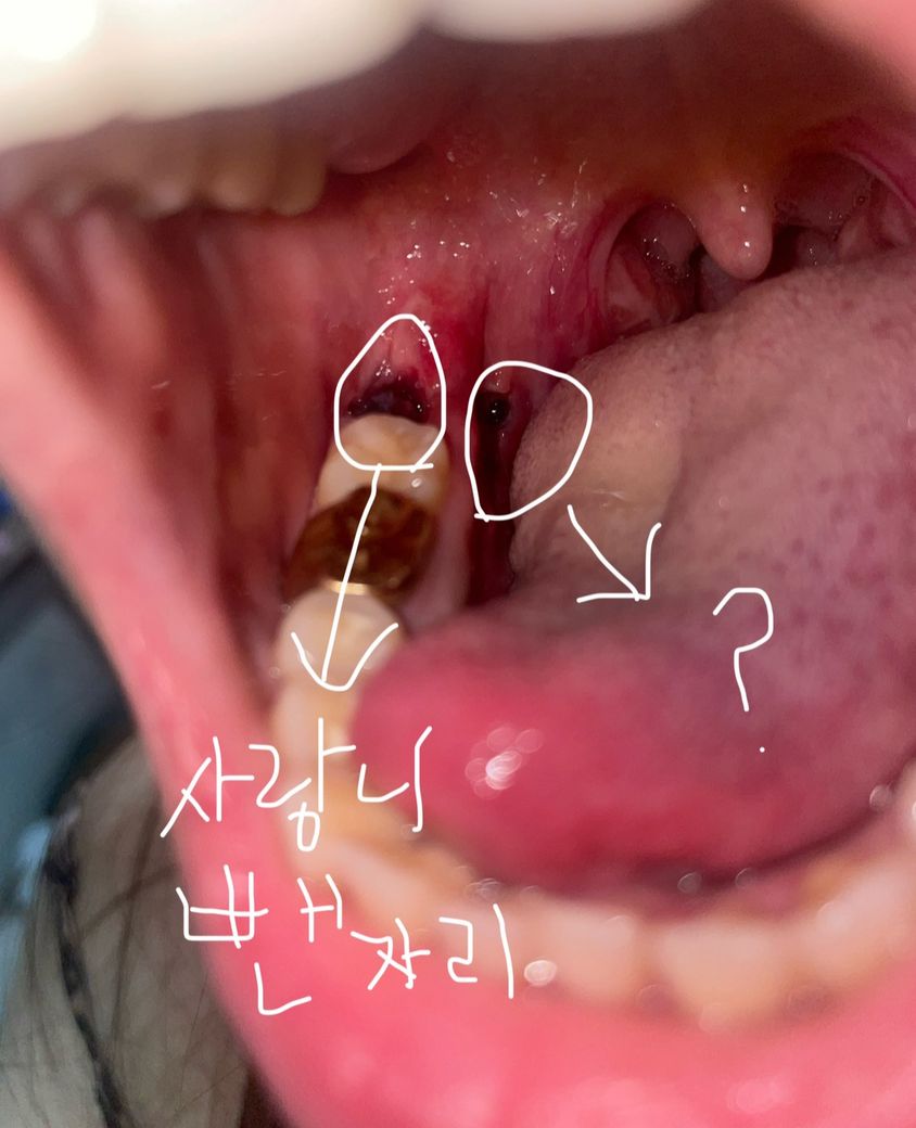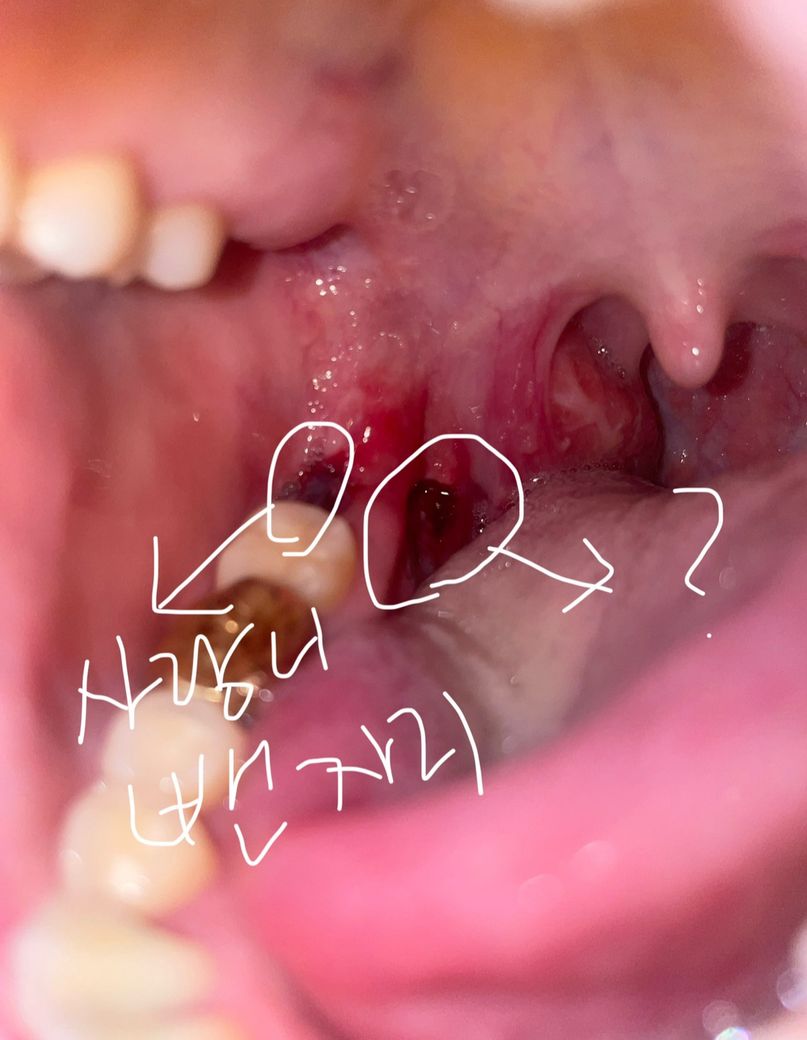 아까 포스트했었는데 더 많은 의견을 듣고자 다시 포스팅합니다. 사랑니 뺀 자리 옆에 더 크게 구멍이나고 그 위에 피떡이 생긴 듯한 모습이 보이는데요 이거 뭘까요?
