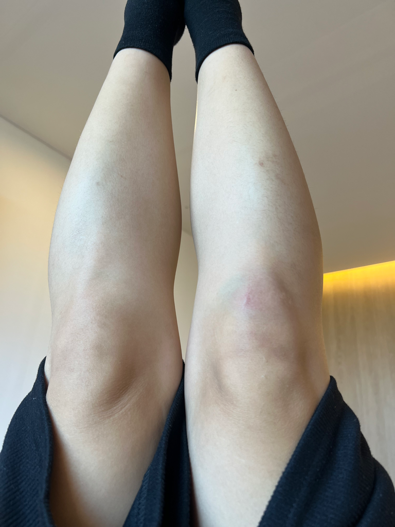오른쪽 무릎뼈가 멍이 들어 보입니다.