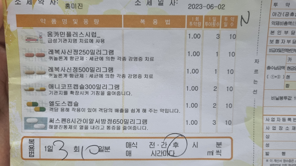 어제부터 초록색 가래와 오한 , 두통이 있어서 오늘(6월2일) 병원에서 처방받은 약입니다.