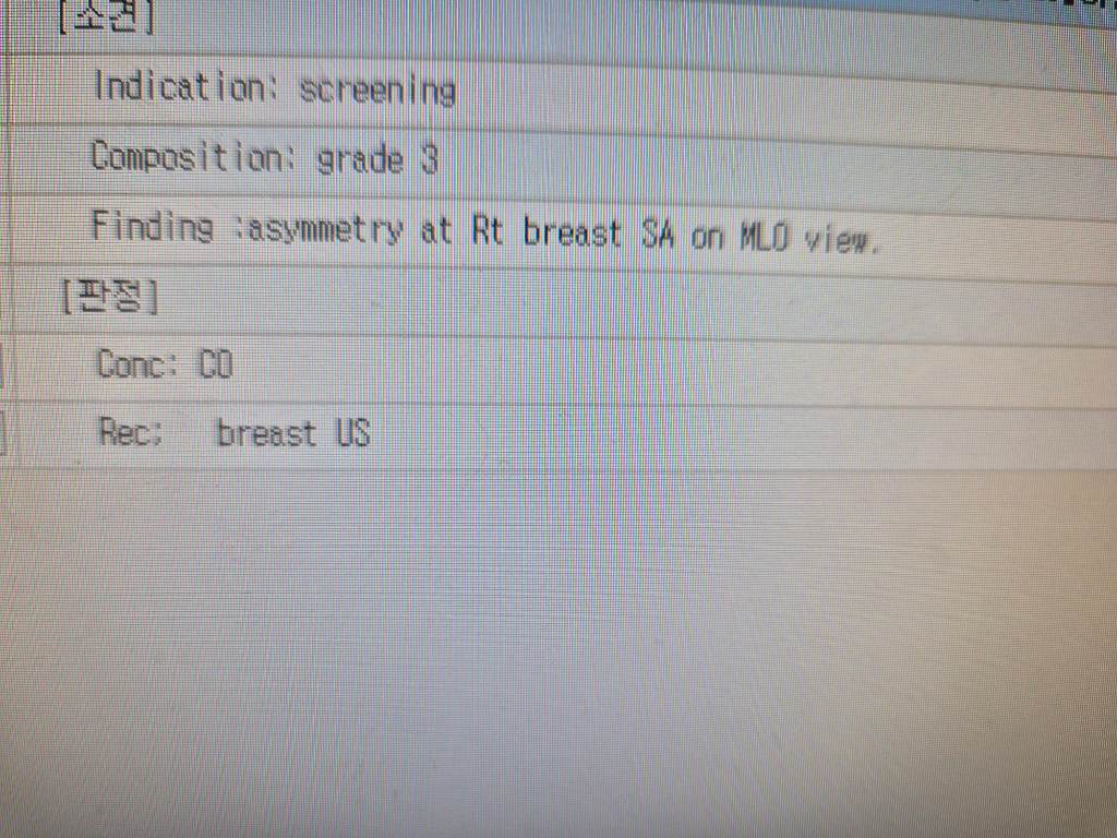 유방촬영상에서 우측유륜하부에 비대층소견이 의심되어서 유방초음파로 확인해보라는것입니다