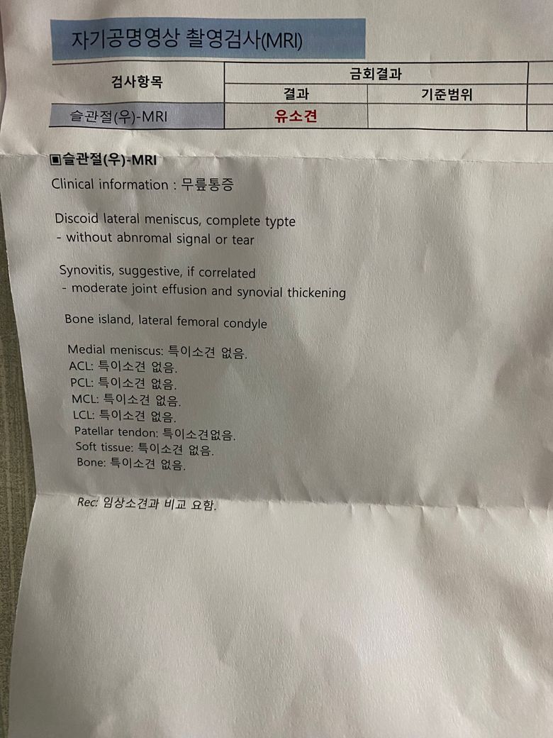 판독지 소견을 보면 바깥쪽 반월판이 디스크 모양이지만 이외의 이상 소견은 없으며, 십자인대 등 다른 부위에는 특이 소견이 없고 활액막염의 가능성이 있는 소견 정도만 있다고 되어 있습니다. 활액막염이 통증의 원인일 가능성이 있어 보입니다.