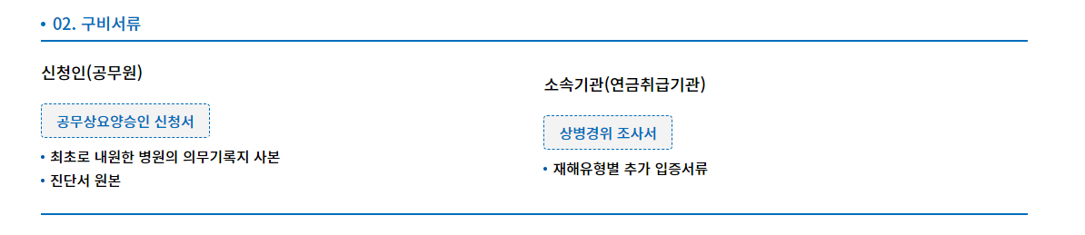 아래 사이트에 보면 공무상 요양승인을 받는 방법이 안내되어있습니다.