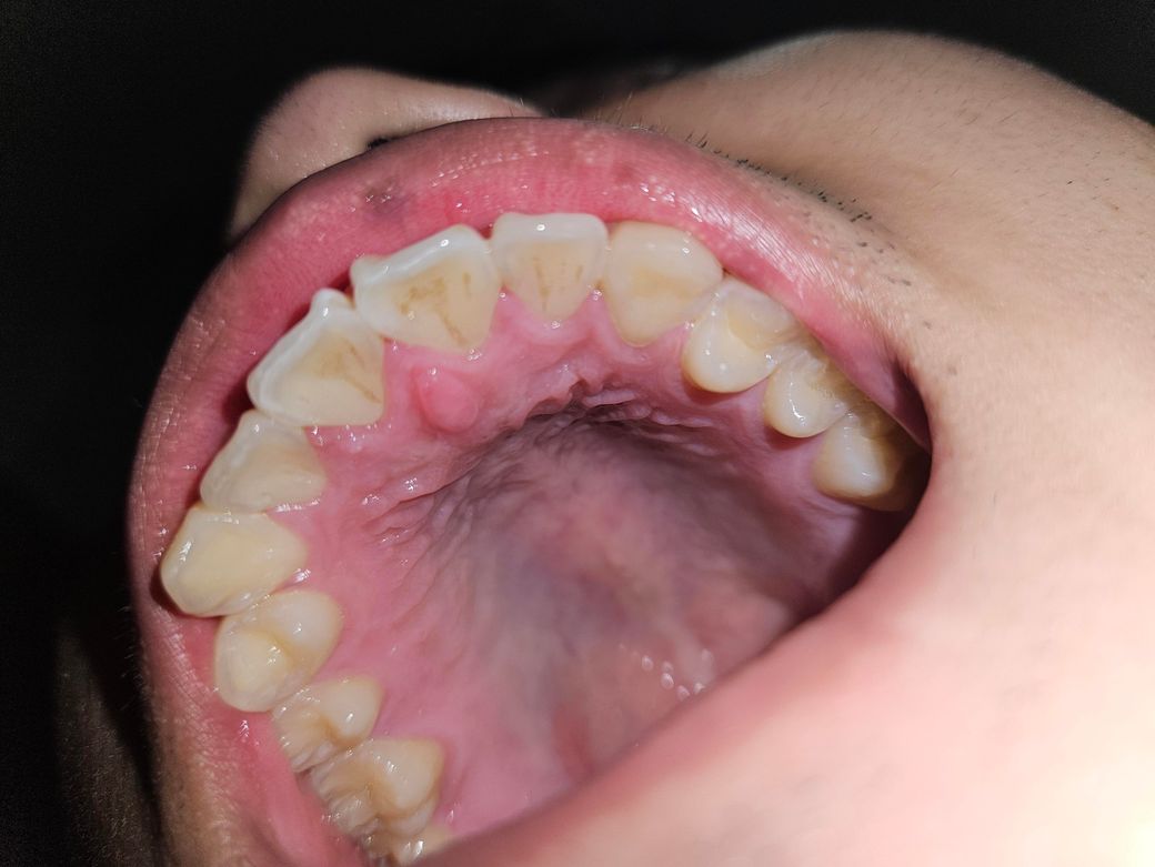 교합을 보기 위해서는 사진으로는 어렵습니다. 단지 해당 사진을 보면 위쪽 앞니 입천장의 치간 유두 부위가 부어 있습니다. 이건 감염일 수도 있으나 단순 위생관리가 부족해서 그런 경우도 있습니다. 일단은 치과에서 스케일링을 한번 받아보시고 증상 개선이 있는지 보시기 바랍니다.