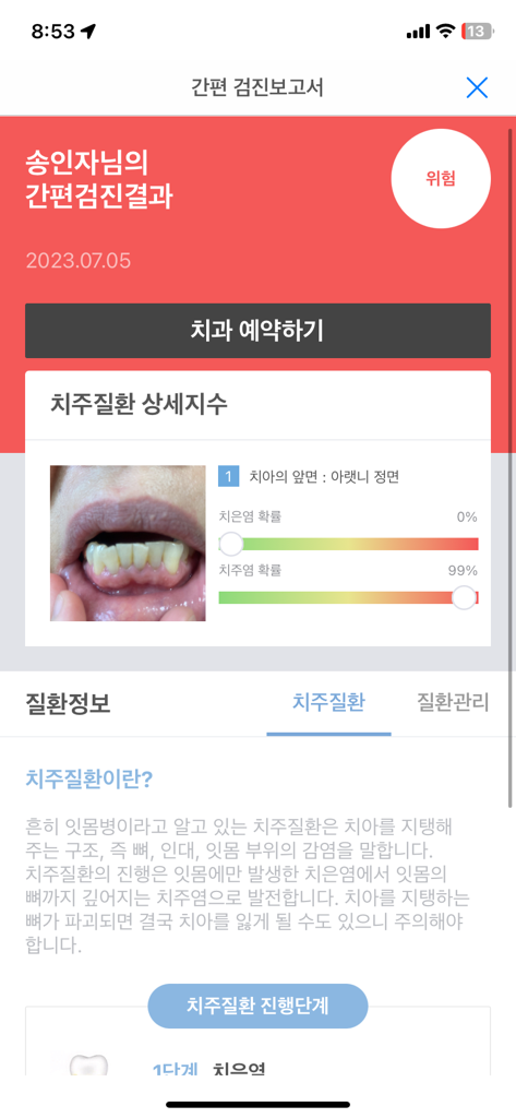 지인이나 어플보다는 치과에 가셔서 검진을 받아보세요.단순히 사진만으로는 치은염을 판단하기는 어렵습니다. 엑스레이 사진도 필요 하죠. 사진상으로 보면 약간 잇몸이 부어 잇는것처럼 보이니 치과에 가셔서 스켈링 및 잇몸치료를 받아보세요.