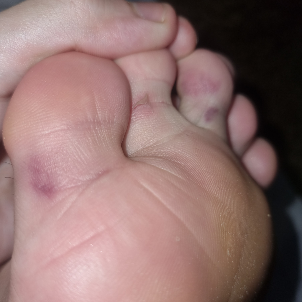 가려움증이나 통증이 동반되지 않고 불편감이 없다면 단순히 압력등으로 눌려서 생긴 병변일수 있어 보이며 가려움증이 있다면 무좀등의 감염성 질환 혹을 알레르기성 질환과ㅣ 관련된 병변일수 있을것으로 사료됩니다.