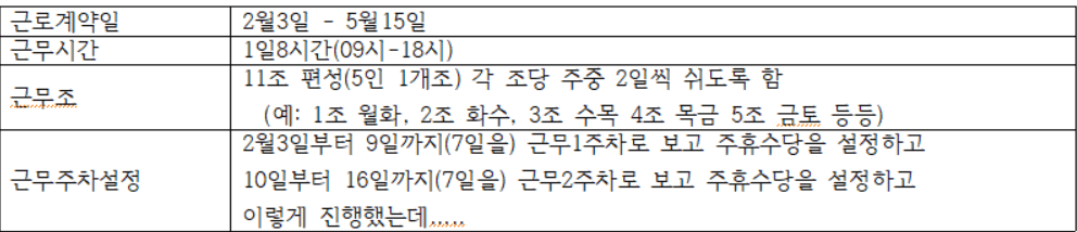 업무특성상 달력상의 토요일 일요일 없이 주중에 조별로 2일을 돌아가며 쉬는 시스템 [1일 무급, 1일 주휴일]