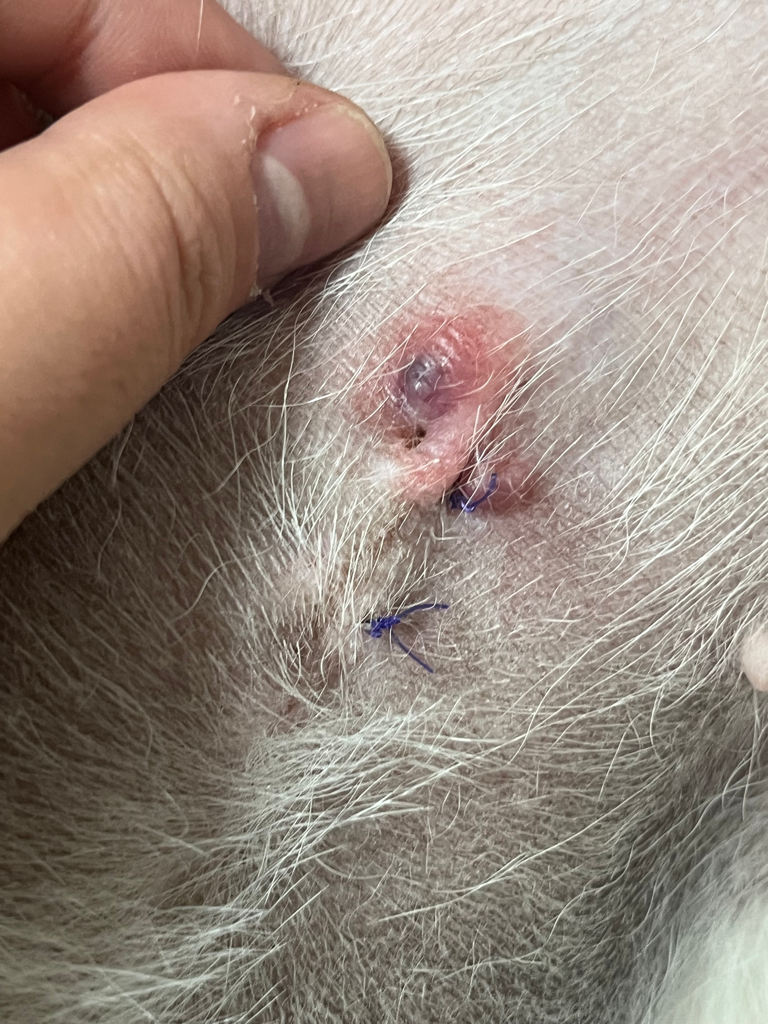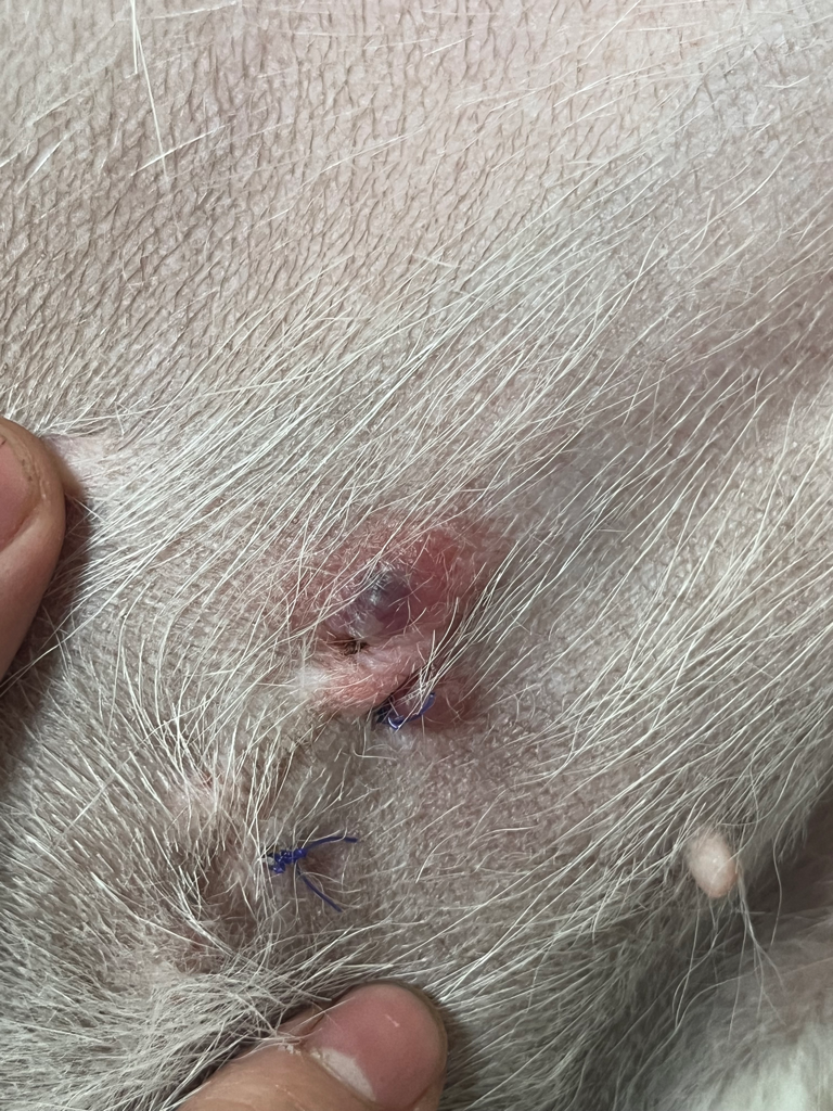 안그래도 실과 피부 사이에 세균이 침투했을 가능성과 자극이 되니 핥아서 염증이 생겼을 수도 있겠네요