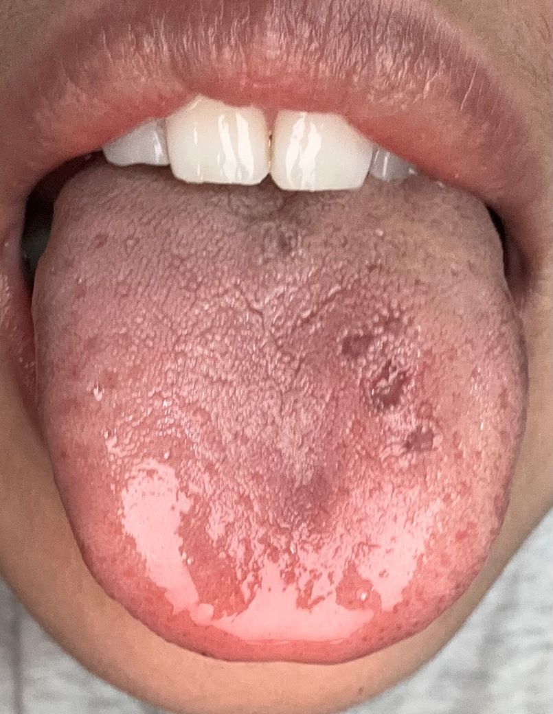 사진과 경과를 종합하면 가장 가능성이 높은 진단은 바이러스성 설염을 동반한 급성 감염 후 변화이며, 구체적으로는 바이러스성 인후염에 동반된 지도설 혹은 탈락성 설염 양상입니다. 혀 표면에 지도 모양처럼 군데군데 붉게 벗겨진 부위와 경계가 불규칙한 반점, 심한 작열감이 보이며, 고열과 인후통이 선행된 점이 이를 뒷받침합니다.