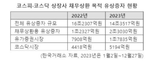 코스피·코스닥 상장사들이 공시한 채무상환 목적의 유상증자는 모두 2조3030억원(27일 기준)으로 집계됐다. 전년(1조2327억원) 대비 86.8% 증가한 수치다.