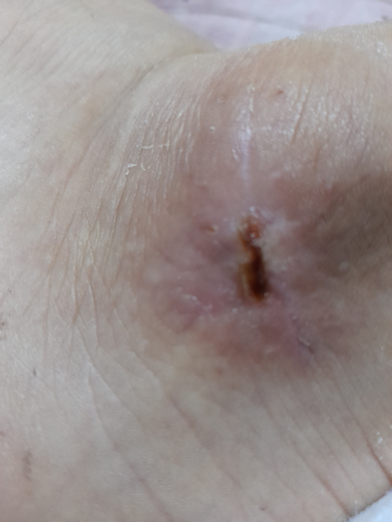 해당 상처부위는 열린 상처 (창상)로 보이며 내부와 열려있는 상태라 특히 내부로 이물질이 들어가지 않도록 주의가 필요합니다. 만일 모래가 들어가게 되면 내부로 염증물질이 차오르면서 심하면 괴사가 진행될 수 있기 때문에 각별히 유념하셔야 겠습니다.
