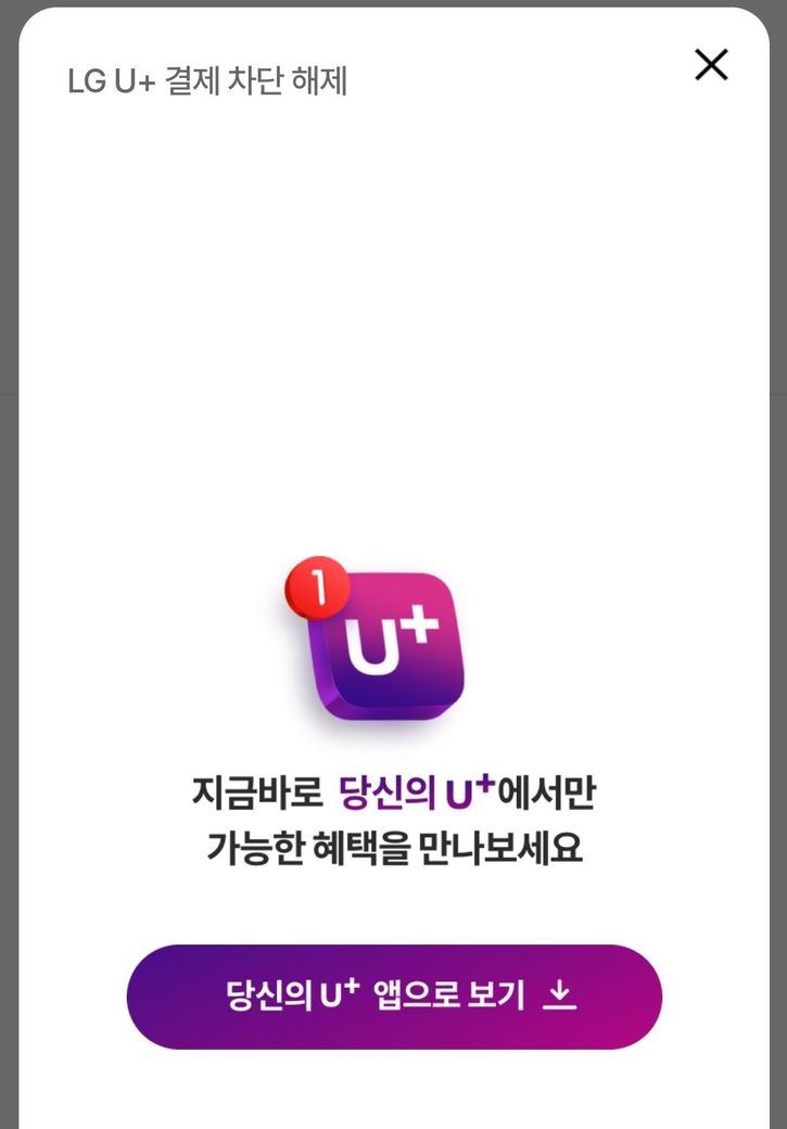 이렇게 안내팝업이 뜨고 결제진행을 할수가 없는데 유플앱다운로드하면 유플에서 개통한고객만 사용할수있다고 나옵니다