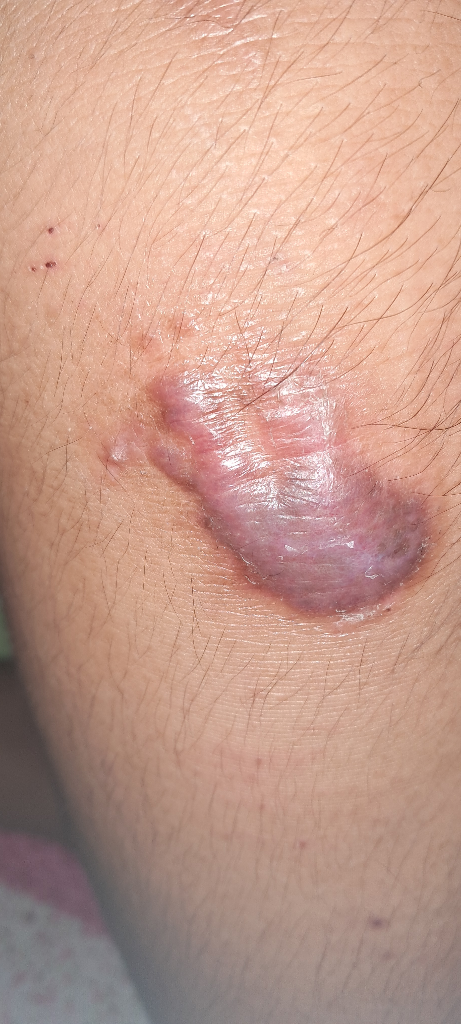 먼저, 사진으로 보았을 때에는 켈로이드의 가능성이 높을 것으로 생각이 됩니다. 켈로이드는 빨리 치료를 시작할 수록 예후가 좋으니, 흉터 클리닉을 운영하는 성형외과 또는 피부과에서 진료를 받으시면 되겠습니다.