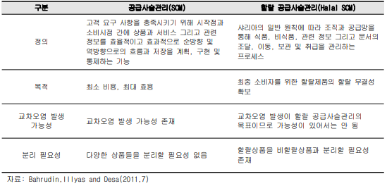 그러나 할랄 공급사슬관리(이하 ‘Halal SCM’)는 비용을 최소화하고 이익을 극대 화하기보다 유통과정에서의 하람과의 접촉을 피해 할랄식품의 무결성(integrity)을 보존하는 것을 목적으로 한다. 즉 상충관계에 있는 비용절감과 이익극대화간 최적 화가 아닌 할랄식품 흐름관리에 있어 무결성을 유지하는데 목적을 두고 있다. 따라 서 전통적인 SCM과 Halal SCM은 목적에서 차이를 보인다.