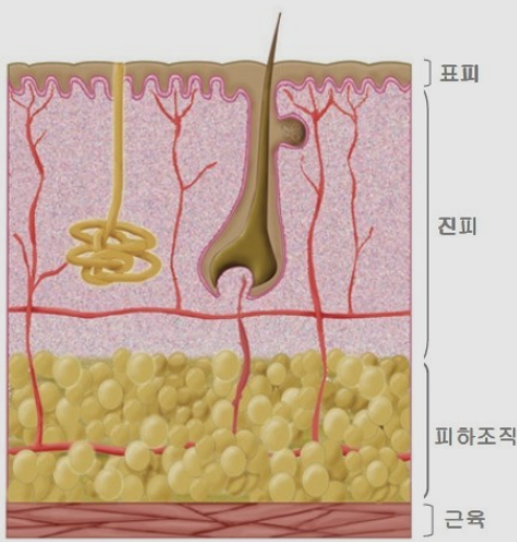 아래 그림을 보시면 껍데기는 피부 (표피, 진피)에 해당합니다.