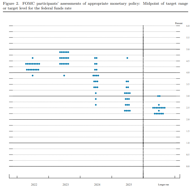 미국의 현재 기준금리는 3.25%이고 지난 21일에 발표한 미연준 FOMC의 기준 금리, 인플레이션 및 고용에 대한 전망치 리포트를 보면 금리 수준은 올해 연말까지 19명의 연준 의원들 중에 과반수 이상이. 4.5% 이상의 금리 수준을 예상했습니다. 현금리보다 1.25% 더 올리겠다는 의미이고 내년에 금리는 5% 인근까지 상승할 수 있고 내후년부터는 점진적 하락을 예상하고 있습니다.