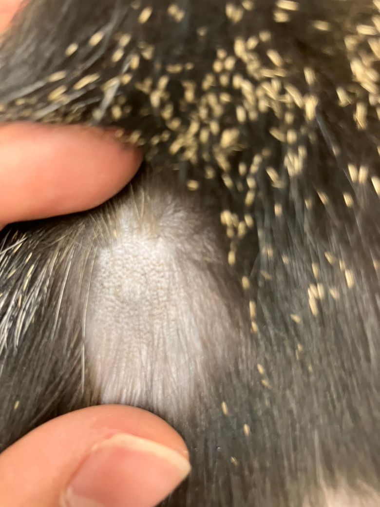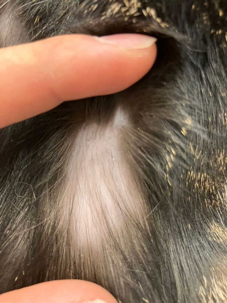 고양이가 핥으려고 하거나 불편해하는 기색은 보이지 않고 육안으로 피부 병변이 보이지는 않아요