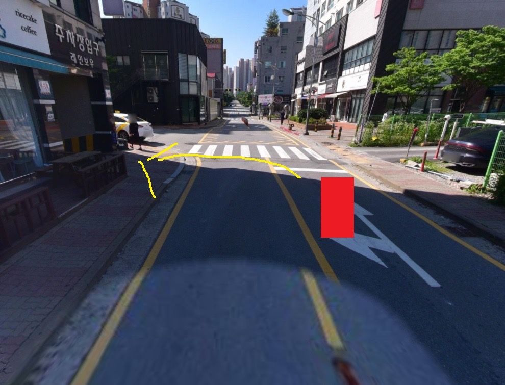 위의 경우 바닥에 직좌 표식이 있고 그에 따라 아파트로 들어가는 것 자체가 도로교통법위반이라고 보기 어렵겠습니다.