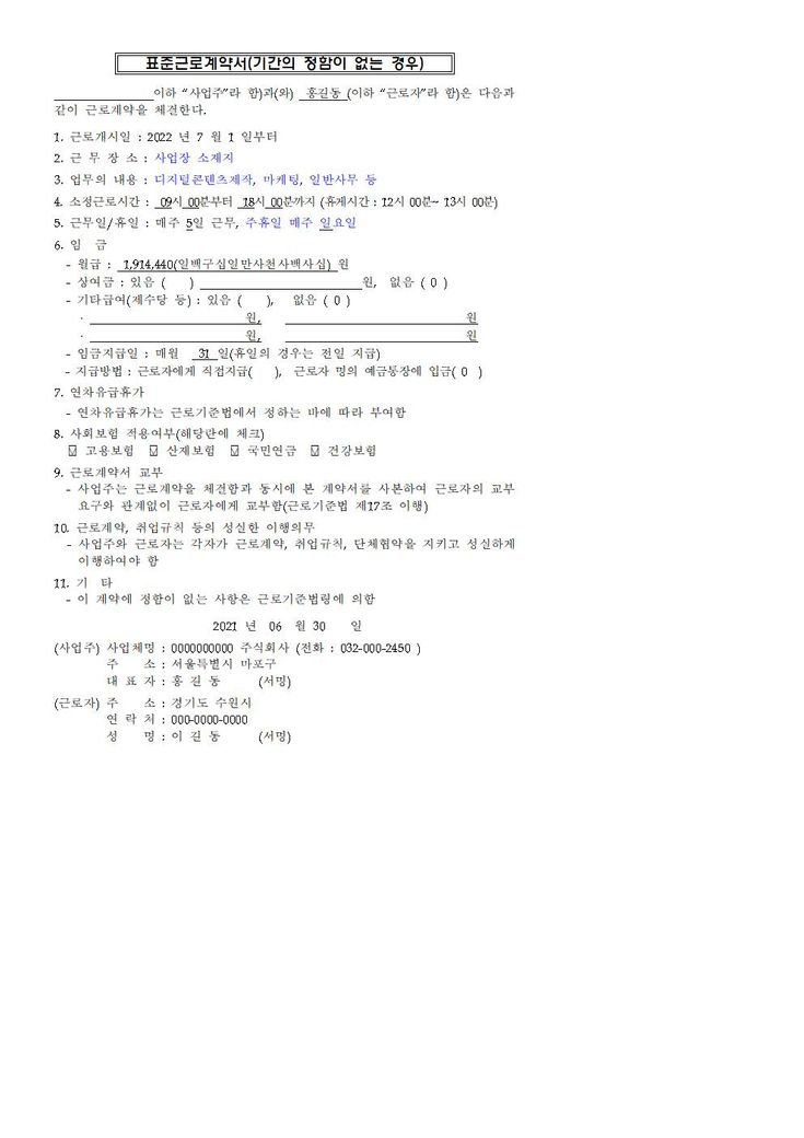 1인 기업으로 회사에서 처음으로 직원채용(최저임금)을 위해 근로계약서를 작성하다보니 작성하는 내용이 맞는지 궁금하여 질의합니다.