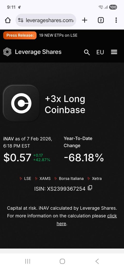 2개의 사진은 같은 종목을 보여줍니다. 0.57이 적혀있는 검은색 사진은 코인베이스 3배 추종 상품을 발행한 실제 회사 홈페이지 사진입니다. 0.52가 적혀있는 하얀색 사진은 인베스팅 닷컴에서 가져온 사진입니다.