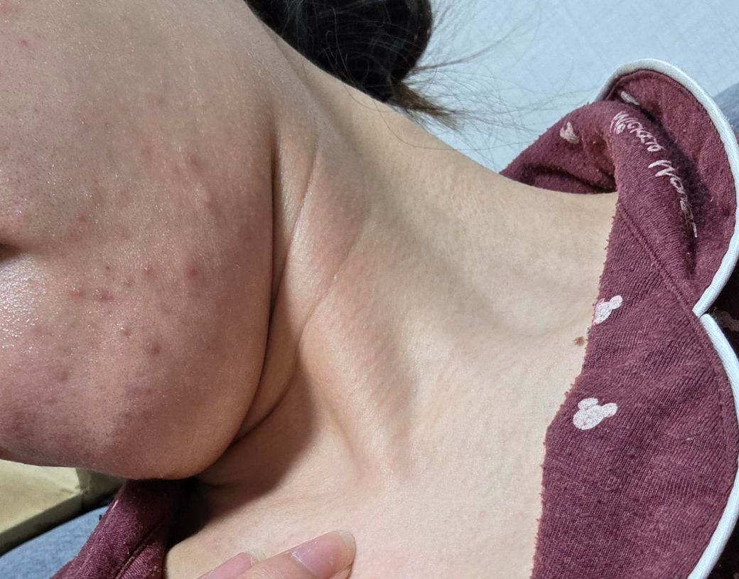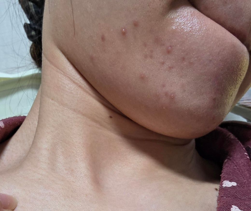 저번주 목요일부터 갑자기 턱에 우둘투둘 뭐가 올라오더니 지금은 사진처럼 좀 퍼진 상태입니다. 특히 오른쪽 부분에 있는 여드름들이 간질간질해서 살살살 긁고싶어요ㅠ