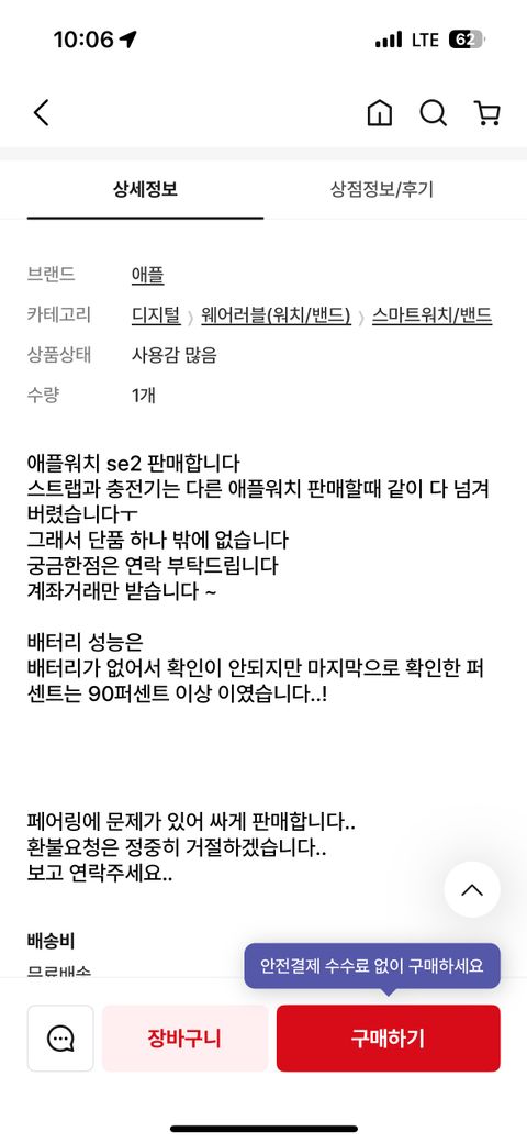 애플워치를 번개장터 통해서 계좌이체로 구매했는데 판매자께서 제목에 그냥 애플워치 se2 40mm 팝니다 라고 적혀있었고 상세설명란에 배터리 효율 지금 배터리가 없어서 확인이 안되는데 마지막으로 본게 95% 이상이였다고 적혀있어서 이체를 진행했습니다.