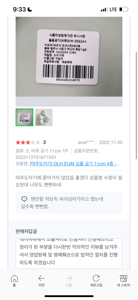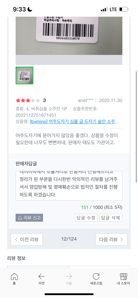 3.무상반품과 관련없는 타 상품 리뷰에도 악의적인 리뷰를 담 ( 뻔뻔하다느니..)