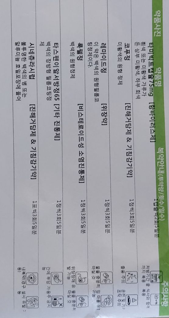 현재 받은 약들을 모두 한번에 같이 먹기에는 중복되는 성분이 많아 권장드리지 않습니다. 아래 사진에 있는 약 중 삼아탄툼액을 추가적으로 사용하셔서 목을 소독하시는 것이 좋겠으며, 이외 아세트아미노펜 성분의 진통제를 독감처방받으신 약들에 추가할 수 있으니 이를 약국 등에서 구매하셔서 사용하시는 것이 좋겠습니다.