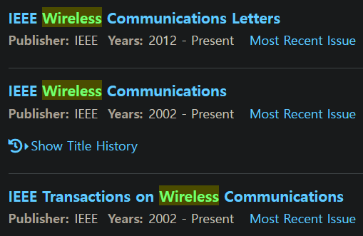 IEEE Transactions on Wireless Communications: IEEE Wireless Communications와 마찬가지로 무선 통신 분야에 대한 원문지이지만, 논문의 길이나 수준이 높아 이 분야에서 인정받는 중요한 학술지 중 하나입니다.