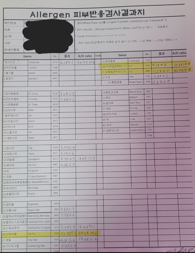 그래서 이 크기보다 큰 반응을 일으키는 원인물질들에 알러지가 있다 라고 설명해주신겁니다. 노란색으로 표시된 고양이털, 미국집먼지진드기, 유럽집먼지진드기의 결과값을 보시면 다들 22.9*9.3, 9.1*4.8, 11.5*6.0 으로 더 큰것을 알 수 있습니다.