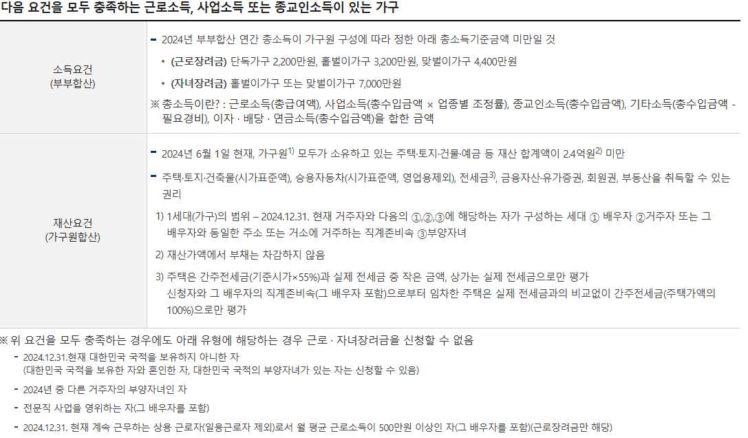 근로장려금은 다음과 같이 소득요건 및 재산 요건을 모두 충족한 자가 신청할 수 있으니 참고하시기 바랍니다.