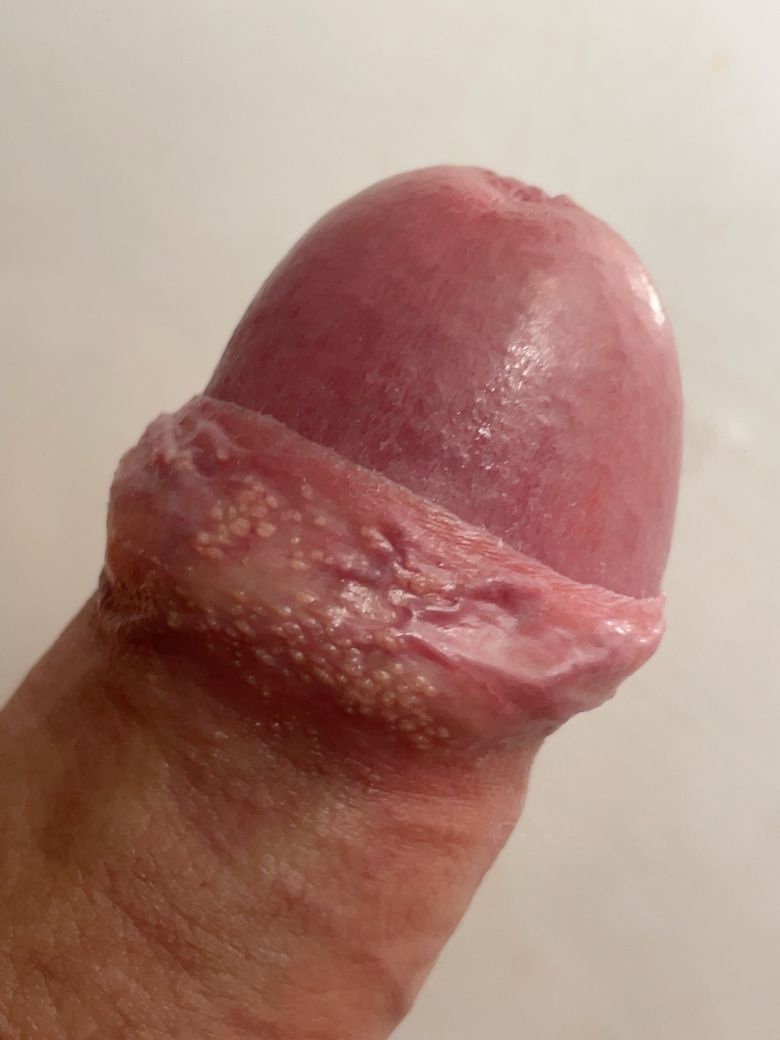 사진상으로는 귀두 바로 아래 포피 안쪽을 따라 작은 하얀 구진들이 고르게 배열되어 있습니다. 통증, 가려움, 분비물 없이 오래 지속되었다면 가장 가능성이 높은 것은 진주양 음경구진(pearly penile papules) 또는 피지선이 보이는 정상 변이(Fordyce spots)입니다. 둘 다 감염이나 성병이 아니며 치료가 반드시 필요한 병변은 아닙니다. 청소년기 이후 흔히 보이고 포경 여부와도 직접적 관련은 없습니다.