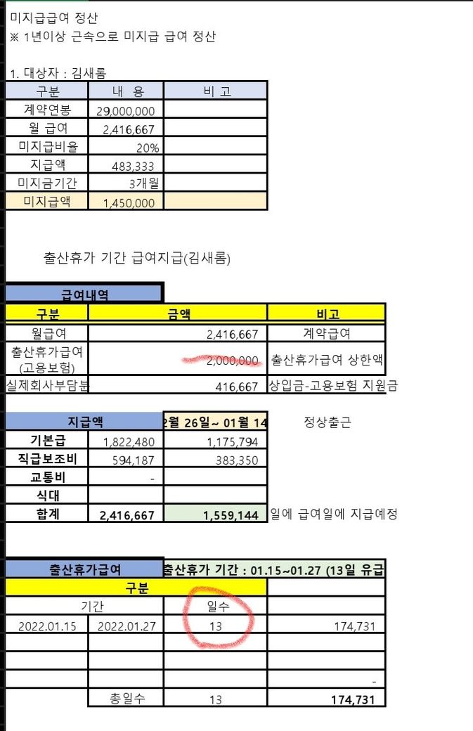 출산휴가 및 급여 일할 계산?