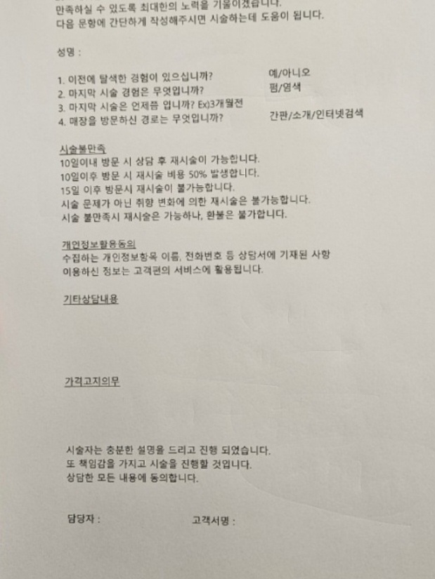환불을 하지 않기로 약정했다면 그러한 약정이 우선되어야 할 것이므로 원칙적으로는 환불받을 수 없을 것입니다. 다만 미용실측에서 중요한 사항을 고지하지 않았거나 기망 등의 방법으로 고객을 속인 행위가 있었다면 시술 계약을 취소하고 환불받을 여지가 있을 것입니다(단순히 시술이 마음에 들지 않는다는 사유만으로는 어려울 듯 합니다).