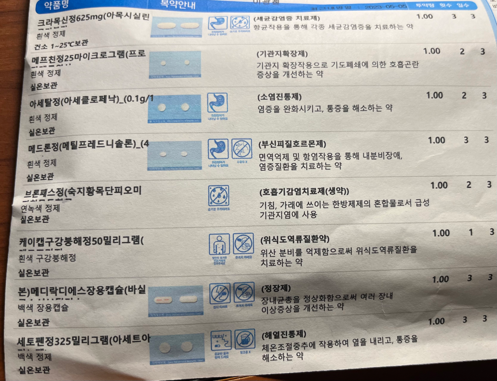 처방받은 약에는 소염진통제, 해열진통제 둘다 들어있어요.