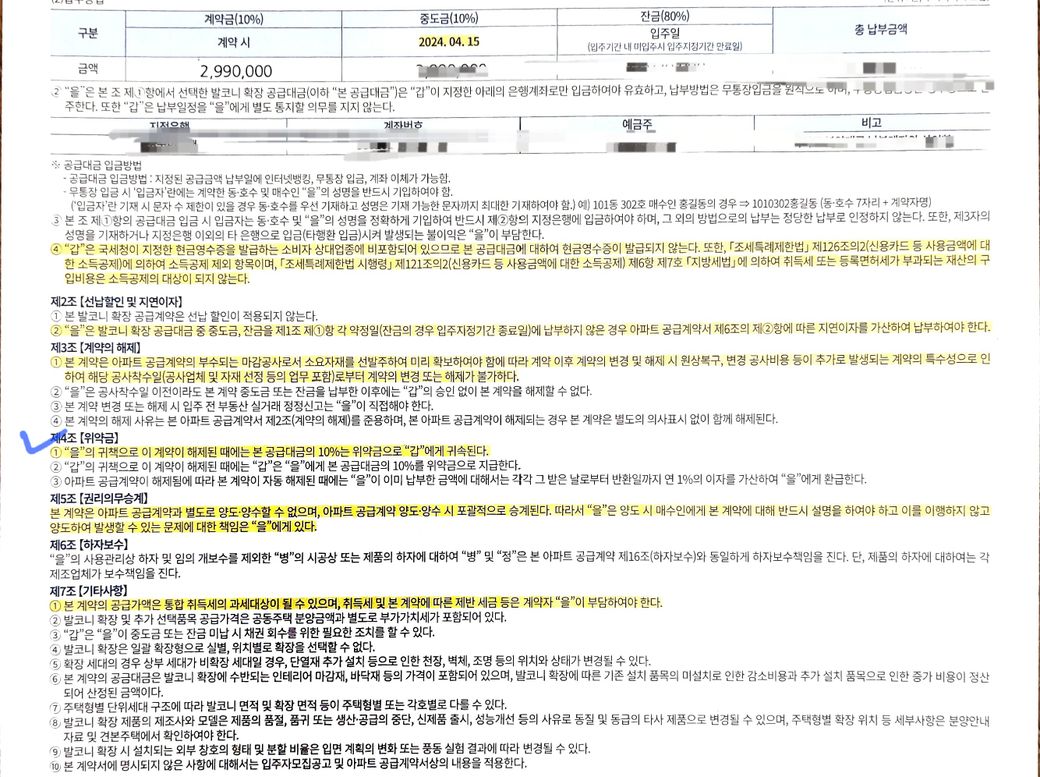 분양 상담사가 하는 말이 위약금 3조1항 총 공급대금의 10%(5000만 원)를 내야한다며 2차계약금을 더 내라고 합니다. 근처 부동산에 물어봐도 낸 것(1300만원) 만 뜯기는 거라고 들었는데 전화로 분양 상담사에게 분양권 포기가 기납금(1300만원)만 위약금 처리가 되는지 물어보니 처음엔 맞다고 하더니 대화 후반엔 2차계약금(4000만 원)을 더 내야 분양포기가 가능하다고 말을 합니다. 겁주는 것 같아서요 2조 2항 개인 사정으로 스스로 해제할 수 있다. 3조 1항의 두 번째 줄 단, 계약금을 분할로 납부한 경우 기납금만 위약금으로한다. 로 1300만원만 내고 나오면 되는것 아닌가요?